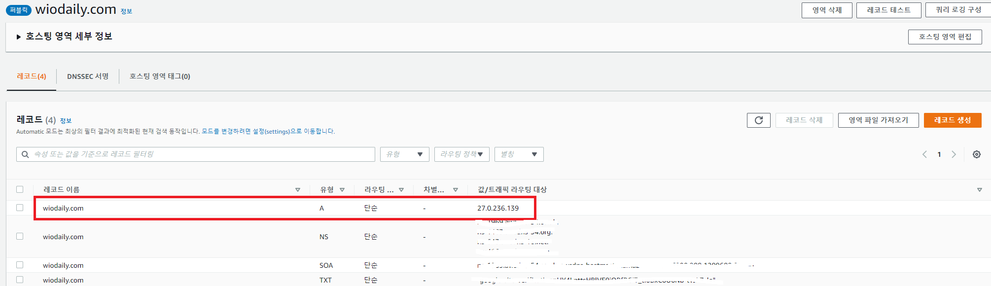 wiodaily.com의 경우 반드시 루트도메인으로 등록해야하는 상황이었기에 IP로 A 레코드를 생성하였습니다!
