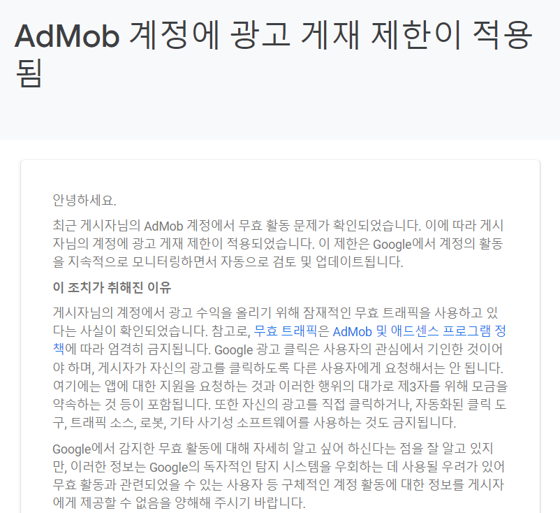 기쁨도 잠시, 구글 애드몹의 제재 처분을 받았습니다.