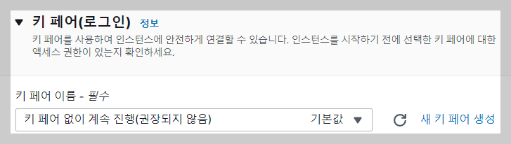 - 키페어(로그인) : 저희 서버의 경우 키페어를 따로 설정하지 않고 PUTTY 로그인을 통해 접근할 예정입니다. 이는 추후에 서버의 config 작업이 필요하며 키페어 방식으로 접근하겠다 하시는 분은 따로 매뉴얼을 참고하시어 진행해주세요!