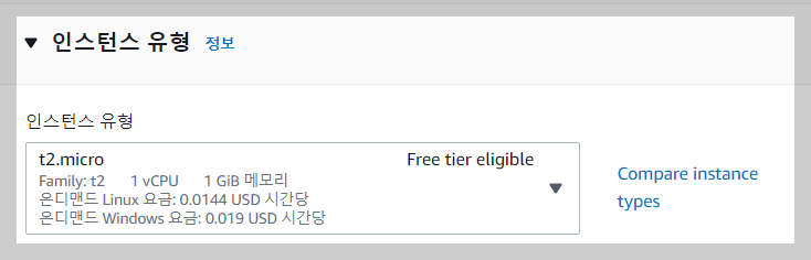 - 인스턴스 유형 : 서버의 스펙을 결정하는 즉, 과금과 가장 직결되는 항목입니다. 신중히 알아보고 선택하세요!