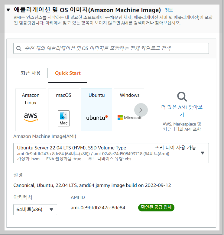 - 애플리케이션 및 OS이미지(Amazon Machine Image) : EC2의 OS를 선택하는 단계입니다!