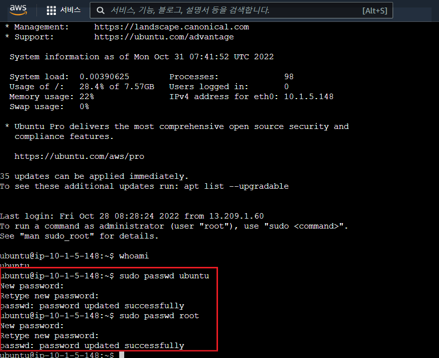2.2. 먼저 root와 ubuntu 계정의 패스워드를 등록해줍니다.