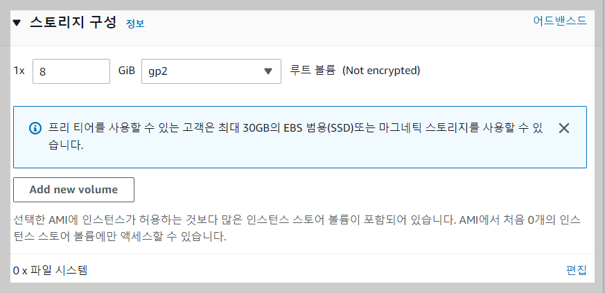 - 스토리지 구성 : 필요한 스펙에 맞춰 스토리지를 구성합니다. 저는 기존 구성 그대로 구성하겠습니다.