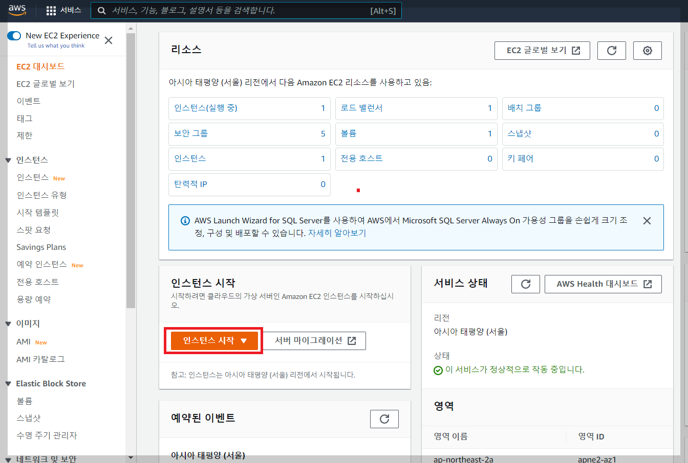 1.3. EC2 구성페이지에서 인스턴스 시작 을 눌러주세요!
