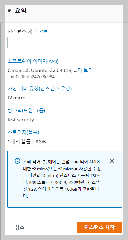 1.5. 요약 항목의 EC2 설정에 대한 세부내용을 최종적으로 확인하고 시작을 눌러줍니다.
